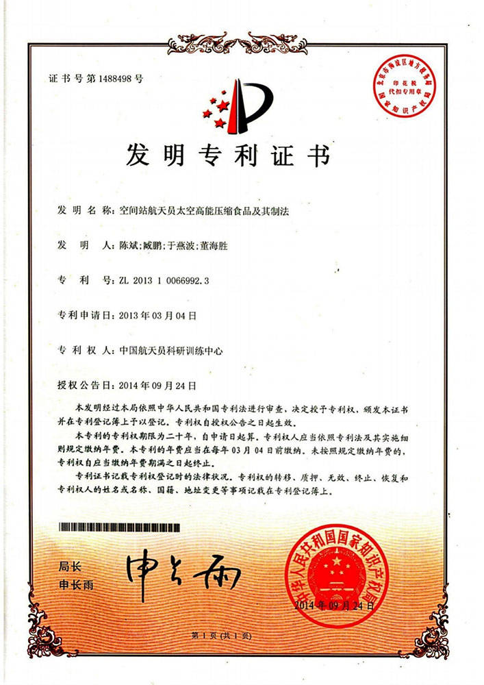 神舟太空食物高科技(深圳)无限公司自成立以来,已走过9年过程。正在这九年里,公司一直专注于航天员食物平易近用化、财产化营业,凭仗着对证量的逃乞降对科技立异的不懈勤奋,成为了该范畴的佼佼者。公司独家具有中国航天员科研锻炼核心授权的空间坐航天员食物专利手艺——《空间坐航天员高能压缩食物及其制法》,专利号:ZL2。3。这一空间坐航天员食物专利手艺,为公司的产物供给了的手艺支持,使其正在市场上享有独家法令樊篱的绝对合作劣势。