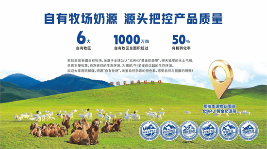 做为新疆驼奶财产的领军企业,那拉集团已建立起笼盖畜牧养殖、仓储运输、市场发卖五大板块联动成长的全财产链模式。正在奶源扶植方面,那拉集团阐扬龙头企业带动感化,正在新疆建成六大自有牧区,面积近1000余万亩,此中无机牧场无机率达50%以上。